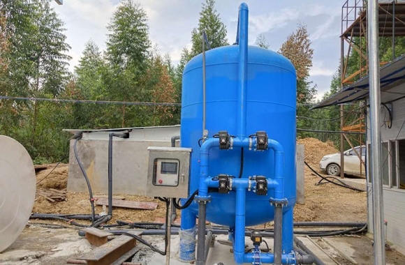 設備是壓力式的,其原理是當原水自上而下通過濾料時,水中懸浮物由于吸附和機械阻流作用被濾層表面截留下來;當水流進濾層中間時,由于濾料層中的砂粒排列的更緊密,使水中微粒有更多的機會與砂粒碰撞,于是水中凝絮物、懸浮物和砂粒表面相互粘附,水中雜質截留在濾料層中,從而得到澄清的水質。經過濾后的出水懸浮物可在3毫克/升以下。